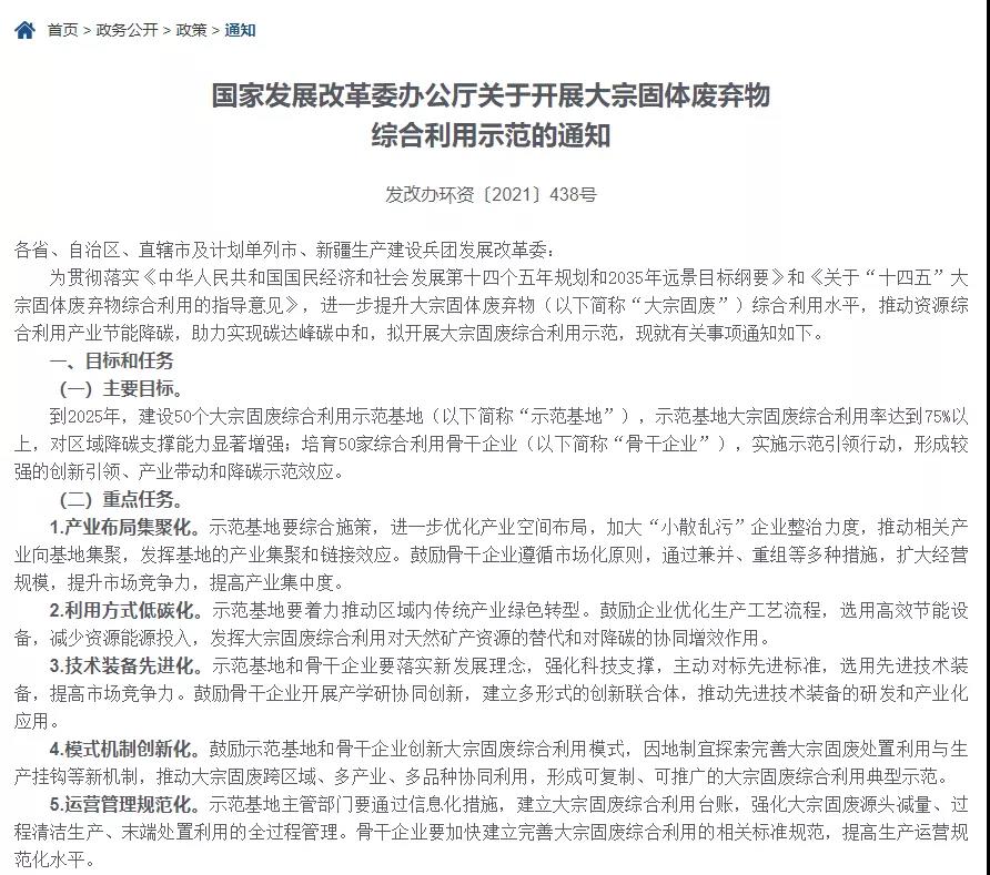 5月30日,國(guó)家發(fā)展改革委辦公廳又發(fā)布了《關(guān)于開展大宗固體廢棄物綜合利用示范的通知》,旨在進(jìn)一步提升大宗固廢綜合利用水平,推動(dòng)資源綜合利用產(chǎn)業(yè)節(jié)能降碳,助力實(shí)現(xiàn)“碳達(dá)峰、碳中和”。